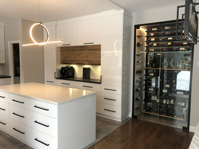 Rénovation complète de la cuisine mettant en valeur une céramique au fini marbré et une palette dominée par le blanc et le noir. L’ensemble crée un espace lumineux, élégant et intemporel, où les textures raffinées se combinent pour offrir un décor moderne et harmonieux.