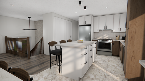 Modélisation 3D dans lequel l’ensemble du rez-de-chaussée devait être repensé afin d’optimiser l'espace de vie. Les besoins principaux incluaient l’ajout de nombreux rangements dans la cuisine et l’intégration d’une douche dans la salle de bain du rez-de-chaussée.